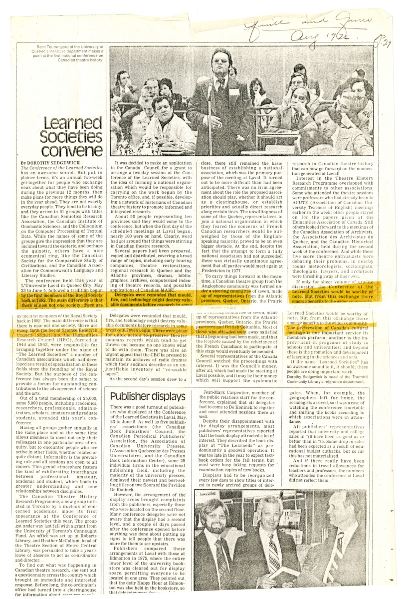 The Canadian Association for Theatre Research is a non-profit organization founded in 1976 to support and encourage research in theatre and performance studies in Canada, with a special interest in Canadian work. Our membership includes scholars, students, and theatre professionals from around the world who are leading developments in our field.
